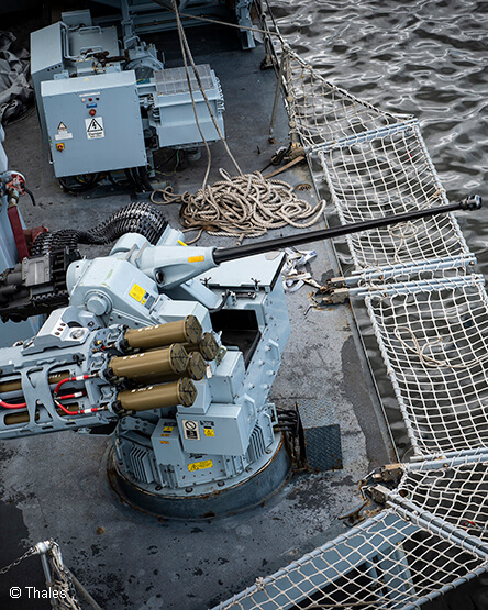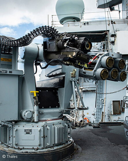 SEAHAWK SIGMA integrates the Thales Lightweight Multi-role Missile (LMM) onto the mount, providing capability to defeat air and surface targets up to approximately 6km. SEAHAWK SIGMA gives the user an enhanced ability to defeat incoming swarm attack and difficult target sets, at range, with precision and limited collateral damage. We are able to offer a range of integration options which includes full fire control and C2 options to reflect differing operational requirements.